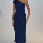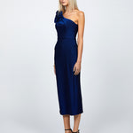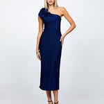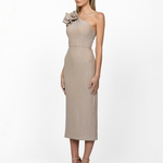 Dazzle in sophistication with this exquisite midi dress. Featuring a chic one-shoulder neckline adorned with a delicate rosette detail, it exudes elegance and charm. The pencil midi skirt is designed with a graceful back split, ensuring effortless movement and a touch of allure. Complete with full lining for comfort, this dress embodies the timeless BARIANO silhouette, perfect for special occasions where style meets grace.