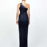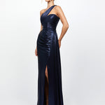 Turn heads in this striking one-shoulder gown, crafted from luminous metallic foil jersey for a glamorous, high-impact look. The bespoke pleated bust detail adds texture and elegance to the asymmetrical neckline, while the structured bodice—complete with boning and built-in bust cups—offers flattering support. A full-length crossover wrap skirt features a sultry front side split for added movement, and the look is elevated with a detachable belt and cascading side skirt detail for extra drama. Fully lined and finished with an invisible back zip, this gown is a show-stopper for any formal occasion.