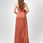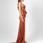 Radiate sophistication in this breath-taking strapless gown, crafted from lustrous stretch satin that hugs the body in all the right places. Featuring a slight asymmetric neckline with a modern fold detail, the structured bodice is enhanced by delicate tucks, built-in cups, and a statement rosette at the hip that cascades into a soft side drape. The full-length skirt flows elegantly to the floor, creating a timeless silhouette perfect for formal occasions. Finished with a back zip closure and partial bodice lining, this gown is the perfect blend of drama and elegance.