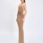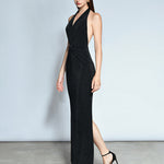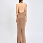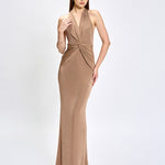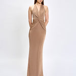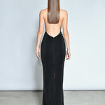 Elegant and contemporary, this full-length gown is crafted from fluid drape jersey for a sleek, figure-flattering finish. Featuring a plunging halter neckline with a twisted front detail and a gathered bodice, it highlights the shoulders while revealing an open low back for added drama. The cinched waistline with a soft draped effect enhances the silhouette, flowing into a full-length column skirt with a back split for graceful movement. Fully lined and finished with an invisible back zip, this gown is perfect for formal events and special occasions.