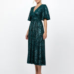 Turn heads in this stunning sequin mesh midi dress, designed for those who love a blend of sophistication and sparkle. Featuring a high rounded neckline with a partially lined sweetheart bodice, this dress offers a chic yet modest touch, while sheer flutter sleeves add delicate movement and femininity. The keyhole back detail brings a hint of allure, perfectly complementing the midi-length fitted skirt with its elegant flounce hemline. An invisible back zip closure ensures a seamless fit, while the partial bodice lining and full skirt lining provide both comfort and coverage. Crafted from shimmering sequin mesh, this dress is perfect for cocktail parties, weddings, or any occasion where you want to shine!