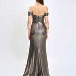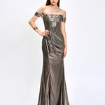 Sleek. Sculpted. Show-stopping. This ultra-modern gown is designed to make an unforgettable entrance. It features a chic straight-across neckline with a dramatic draped cowl detail and detachable sleeves, giving you two looks in one — wear it your way.