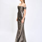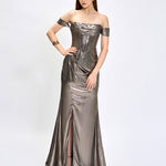 The structured bodice with exposed boning and a flattering V waistline accentuate your figure with architectural precision. Flowing into a full-length crossover skirt, the design is elevated by an asymmetric pleat detail and a daring front side split for just the right amount of drama.