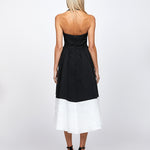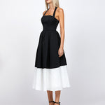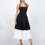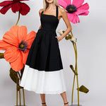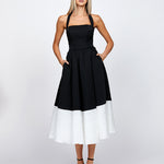 Elevate your style with this chic and modern dress, featuring a straight-across halter neckline with thick straps for a bold yet elegant look. The midi-length A-line skirt is designed with flattering waist gathers and convenient side pockets, adding both charm and practicality. A striking contrast hemline adds a unique touch, making this dress truly stand out.