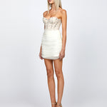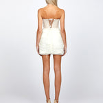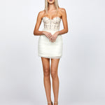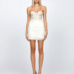 Get ready to dazzle in this glamorous strapless mini dress! Featuring a cupped, underwired sweetheart neckline, the corset bodice is adorned with all-over diamante appliqué for a touch of sparkle. The lace-up back detail adds an extra layer of elegance and allure.