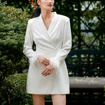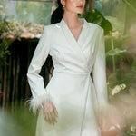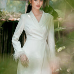 Embody the elegance of our CATALINA FEATHER CUFF BLAZER DRESS, boasting an elegant twist on the usual tailored blazers. The crossover front detail and built-in shoulder pads ensure a flattering silhouette, while full-length sleeves adorned with delicate feather trim add an exquisite feminine touch. With its mini-length wrap-style skirt, this dress radiates sophistication, making it perfect for any bridal shower or high tea affair. Elevate your style and charm with this enchanting ensemble, designed to captivate attention at every occasion.