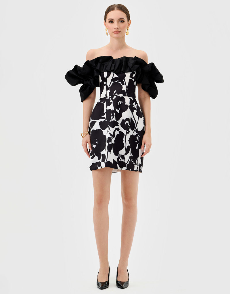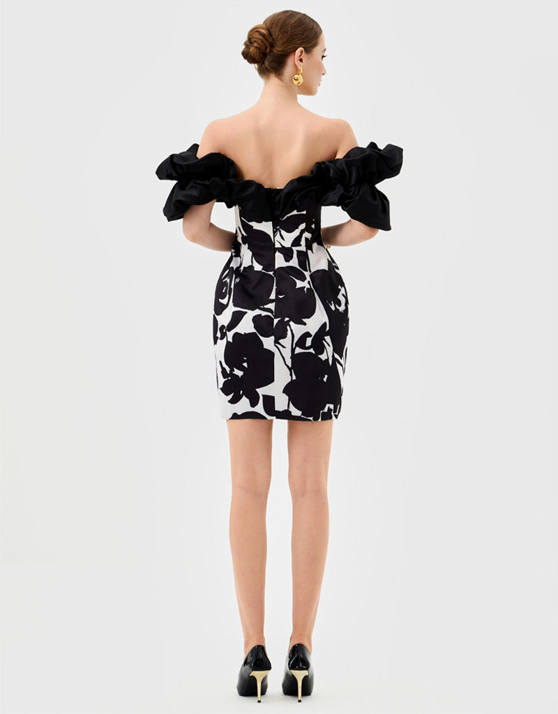 Cut with an off-shoulder neckline, this dress is defined by a voluminous bubble ruffle that frames the décolletage. The fitted bodice is shaped with paneled seams before falling to a bell-shaped mini skirt. Fully lined and finished with an invisible back zip for a clean close.