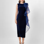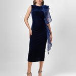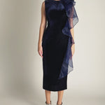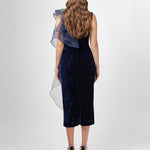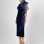 Command the room in the Charlie Cascading Ruffle Midi. Crafted in a luxe velvet finish, this statement piece features a high round neckline adorned with a dramatic sheer organza ruffle that cascades elegantly down one side. The fitted silhouette hugs the figure, finishing at a refined midi length with a subtle back split for added movement. Built-in bust cups and full lining ensure a smooth, flattering fit, while the invisible back zip makes for effortless wear. Perfect for formal evenings or special occasions where glamour is a must.