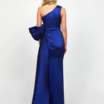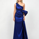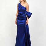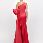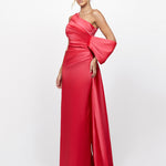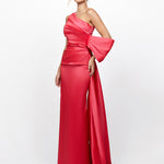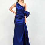 Make a statement in this chic and sophisticated one-shoulder gown, designed for those special occasions where elegance is key. The striking one-shoulder neckline, with built-in cups, offers both support and a flattering fit. The structured pleated bodice enhances the silhouette, while the sleeve adds a modern, dramatic touch, allowing you to customize the look to suit your style.