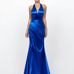 The full-length fishtail skirt is beautifully crafted with asymmetric side pleats and a sultry side split, creating movement and allure. Finished with an invisible back zip closure, full lining, and a structured hemline for that perfect fit, this gown is made from luxurious slinky jersey fabric that drapes elegantly over the body.