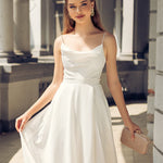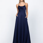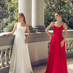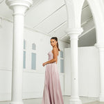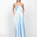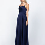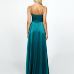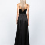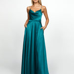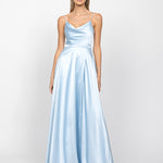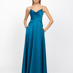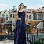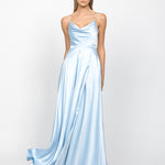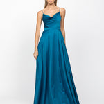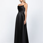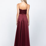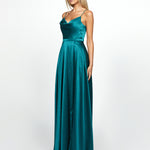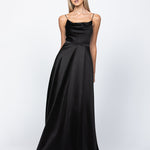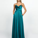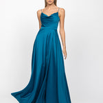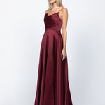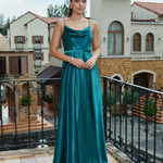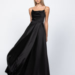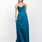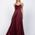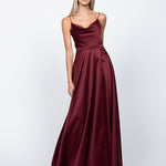 The DIAMOND COWL WRAP GOWN is a Bariano classic and a staple for bridesmaids, available in multiple colorways to suit any occasion. Achieve timeless elegance in this maxi dress featuring a chic scooped cowl neckline with delicate thin spaghetti straps for a graceful look. The dress is designed with built-in bust cups and a boned bodice to ensure a flattering and supportive fit. A full-length wrap skirt adds sophistication, while the open front side split allows for easy movement and a hint of allure. Perfect for weddings and formal events, it promises a stunning and memorable appearance with its versatile and timeless design. Pair with an open-toed shoe, statement earrings and loose curls for a glamorous look.