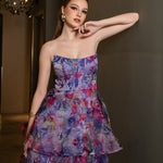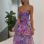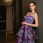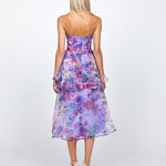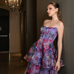 The show-stopping, multi-tiered A-line midi skirt adds dynamic movement with its structured hemline, giving you a perfect balance of grace and drama. The invisible back zip ensures a sleek fit, while the shimmer organza fabric offers a subtle sparkle. Fully lined at the bodice and partially lined at the skirt, this dress delivers both comfort and glamour.
