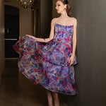 Embrace elegance and flair with this one-of-a-kind strapless dress! Featuring a chic scooped neckline and built-in cups, the structured bodice showcases top-stitched corset paneling for a modern, tailored touch.