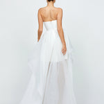 The layered A-line hi-low skirt brings playful movement and drama, revealing just enough with every step. Designed with a short skirt lining and an invisible back zip closure for a smooth, comfortable finish.