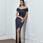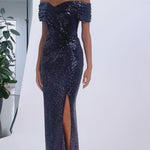 Elevate elegance with our EVANIE DRAPED OFF SHOULDER SEQUIN GOWN. The off-shoulder design exudes allure, while showcasing craftsmanship through the hand pleated details on the sleeves and bodice. A detachable rosette waist feature adds glamour and versatility. The column-style skirt, with a front side split, offers both style and movement. Whether it's a prestigious black-tie affair or an exclusive wedding celebration, this dress promises unparalleled elegance.