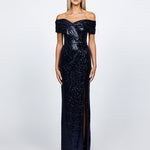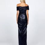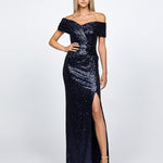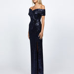 EVANIE DRAPED OFF SHOULDER SEQUIN GOWN B68D12L