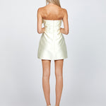 Step into playful elegance with this chic strapless mini dress, designed to capture attention at any event. Made from textured satin, this piece features a dramatic bow detail at the neckline, adding a charming and feminine touch. The boned bodice with built-in cups ensures a flattering, structured fit, while the mini-length off-body skirt provides a fun and flirty silhouette. An invisible back zip closure offers a seamless finish, and the full lining ensures a comfortable wear from day to night.