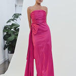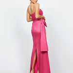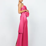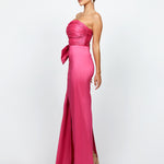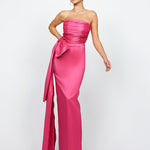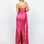 The Gabrielle Strapless Column gown is the epitome of modern elegance with a touch of drama. Designed with a strapless straight-across neckline and a beautifully ruched bodice, this dress creates a sleek and sophisticated silhouette. The standout feature - a detachable dramatic side bow with a long sash - adds a striking, couture-inspired element. The full-length column skirt skims the body effortlessly, complete with a back split for ease of movement. Crafted from luxurious taffeta and finished with an invisible back zip closure and full lining, the Gabrielle is a statement piece perfect for any high-glamour occasion.