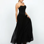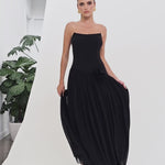 Channel effortless elegance in this strapless chiffon maxi dress, designed for modern sophistication. The scoop neckline and boned bodice provide a structured, flattering fit, while the dropped asymmetric waistline creates a unique, elongating silhouette.