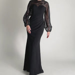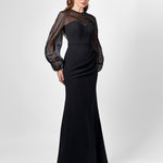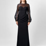 Romantic and refined, this floor-length gown is designed to captivate. Featuring an illusion high round neckline and sheer puff sleeves, it blends delicate detailing with structured elegance. The bodice is fitted with bust cups and boning for a sculpted silhouette, while the fishtail skirt flows gracefully with side tucks that add texture and dimension. Crafted from stretch crepe and fully lined for a smooth fit, it’s finished with a back keyhole closure and invisible zip—perfect for making a graceful entrance at your next formal event.