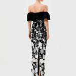This gown is designed with an off-the-shoulder sweetheart neckline framed by a ruffled taffeta trim. The fitted bodice tapers into the waist before falling to a sleek full-length column skirt, finished with a back split for ease of movement. Fully lined and secured with an invisible back zip for a clean close.