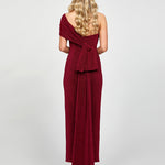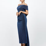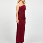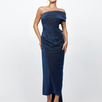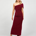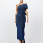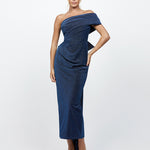 The Isa Off-Shoulder Metallic Jersey Midi Gown is a modern take on classic elegance, designed to make you the center of attention at any formal event. The unique off-shoulder single sleeve neckline with front tuck detailing adds a sophisticated touch to the design, while the dramatic bow and full-length sash at the back bring a touch of whimsy and romance. The gathered side waistline and draping across the front skirt create a flattering silhouette, enhancing the natural curves of the body.