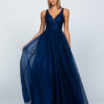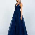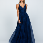 Shimmer and shine the night away in the luxe tulle skirt made from glitter organza, that is guaranteed to reflect from any light. The deep plunge with mesh detailing ensure that you show a little skin, even in such an extravagant dress. Dance comfortably knowing you are support with thick straps and bust boning.