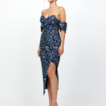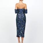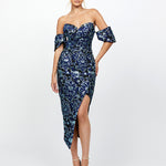 Chic and versatile, this jacquard midi dress is designed to turn heads with its flattering sweetheart neckline and elegant detachable off-shoulder sleeves, allowing you to customise your look. The fitted bodice is expertly structured with boning and built-in bust cups for a secure and sculpted fit. An asymmetric hemline and cutaway side split add modern edge and movement, while the invisible back zip and full lining ensure a smooth, comfortable finish. Perfect for cocktail events, weddings, or any stylish soirée.