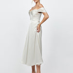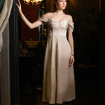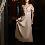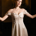 The ultimate choice for anyone who desire a blend of classic elegance and modern sophistication. This luxurious satin dress features a sweetheart off-shoulder neckline with a pleated bust, paired with a boned bodice and draped sleeves for a flattering and supportive fit. The midi-length A-line skirt flows gracefully and is complete with hidden side pockets, adding both style and practicality. Fully lined for comfort, this dress is finished with an invisible zip closure at the back, ensuring a seamless and flawless appearance.