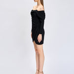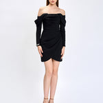 Effortlessly elegant with a touch of drama, this mini dress is designed to flatter from every angle. Featuring a straight-across neckline with off-shoulder fitted sleeves and a soft drape detail, the bodice is structured with bust cups and boning for added support. The skirt showcases a crossover design with subtle side tucks, creating shape and movement. Made from a luxe stretch crepe and fully lined for a smooth fit, it’s finished with an invisible back zip for a seamless look—perfect for your next event or night out.