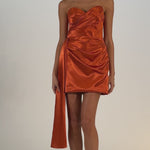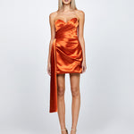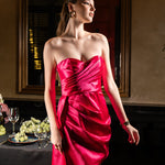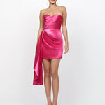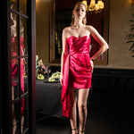 Elevate your style with this stunning strapless mini dress! Featuring a sweetheart neckline with built-in cups for a flattering fit, the asymmetric pleat detail across the boned bodice adds a unique, sculpted look. The mini-length skirt with side pleating creates a playful yet elegant silhouette, while the draped side front sash adds a sophisticated touch of movement.