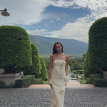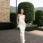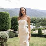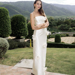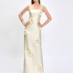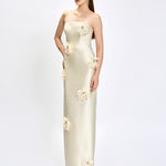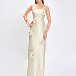 Elegant and romantic, this full-length gown is crafted from luxurious, thick satin with scattered 3D floral appliques for a delicate, textured finish. Featuring a strapless straight-across neckline and a structured bodice with built-in cups, it flatters the silhouette while providing support. The sleek column skirt flows gracefully to the floor, enhanced by a back split for ease of movement. Fully lined and finished with an invisible back zip, this gown is perfect for formal events and special occasions.