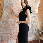 Ruffle frills and thigh-high splits: what's not to love about the Kristi? This dress is perfect for weddings and bridesmaids, pair with nude heels and a sleek up-do to show off that shoulder detailing.