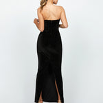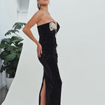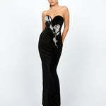 Make an unforgettable entrance in this diamante velvet maxi dress, a perfect blend of sophistication and allure. Featuring a plunging sweetheart strapless neckline, this gown highlights your décolletage while offering a structured, figure-enhancing fit.