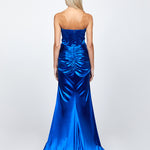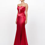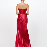 Embrace show-stopping glamour with the Lameria Sweetheart Fishtail gown, a breath-taking design perfect for turning heads. This gown features a strapless sweetheart neckline with intricate crossover pleat detailing, adding dimension and sophistication to the bodice. The corset-style bodice, complete with a sheer center front panel and dropped waist, creates a strikingly sleek silhouette.