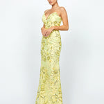 Designed to captivate, this mesmerizing gown features a plunging V-neckline with delicate spaghetti straps and a sheer mesh insert for the perfect balance of allure and elegance. The fitted bodice with built-in cups enhances the silhouette, while the open tie-up back adds a sultry, eye-catching detail. A full-length fishtail skirt creates a dramatic, figure-hugging shape that flows effortlessly with every step. Crafted from intricately embroidered sequin fabric, this gown shimmers beautifully from every angle. Finished with an invisible back zip closure and full lining, it’s a stunning choice for making a bold and unforgettable entrance.