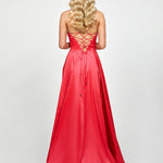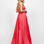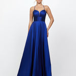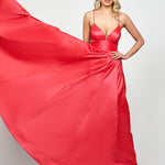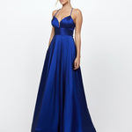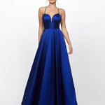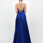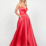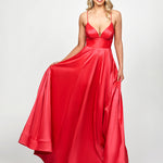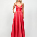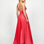 p;Exude effortless glamour in this stunning A-line gown, designed to turn heads at any formal event. The plunging V-neckline, paired with delicate spaghetti straps and built-in cups, creates a flattering and supportive fit that enhances your natural shape. The open V-back with an adjustable lace-up detail adds a touch of sultry sophistication, allowing you to adjust the fit for ultimate comfort.