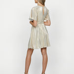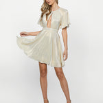 Shimmer and shine the night away in the Lucelia. Featuring a high neckline with cut out front and flutter sleeves crafted in shimmer stretch mesh, she's the perfect party dress.