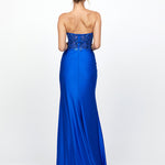 Dazzle in this show-stopping fishtail gown, featuring a soft sweetheart neckline adorned with appliqué lace and delicate beading. The sheer bodice stuns with exposed boning and built-in cups for a sculpted fit, while the draped jersey skirt flows into a dramatic high split with a sheer embellished mesh insert. Crafted from sequin lace and stretch jersey, this fully lined gown is finished with an invisible back zip for a flawless fit—made to own the spotlight.