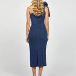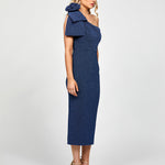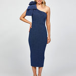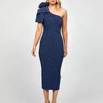 The Magdalina One-Shoulder Midi Dress exudes contemporary glamour with its asymmetrical one-shoulder neckline, featuring a chic bow detail for an added touch of elegance. The detachable rosette gives you the option to personalize the look, adding versatility to this show-stopping dress.