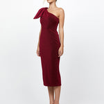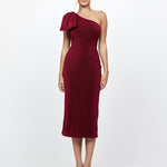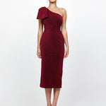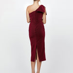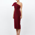 The Magdalina One-Shoulder Midi Dress exudes contemporary glamour with its asymmetrical one-shoulder neckline, featuring a chic bow detail for an added touch of elegance. The detachable rosette gives you the option to personalize the look, adding versatility to this show-stopping dress.