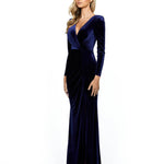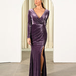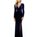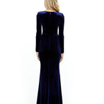 Discover your Goddess energy in the MARIHAN. The draped bodice, full-length skirt, long sleeves and front side split will hug you in all the right places, for any body type. The MARIHAN is draped in a luxe-velvet material, and you will never regret the touch of velvet. Pair with a simple heel to allow the dress to shine or style with a statement heel for an extra level of glamour.