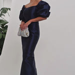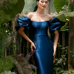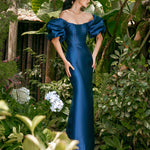 Turn heads with our flirty full-length column dress, designed to make you feel effortlessly glamorous. The slight scooped off-shoulder neckline playfully showcases your shoulders, while the short elasticated puff sleeves add a sweet, flirtatious touch. The off-body column skirt flows with a carefree elegance, featuring a cheeky back split that adds just the right amount of sass. Fully lined for your comfort, this dress glides smoothly over your curves, with an invisible zip closure at the back for a flawless finish. Made from luxurious Printed Duchess Satin adorned with a charming flower print, this dress is perfect for making a stylish statement with a touch of playful allure.