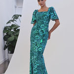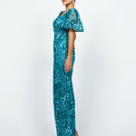 Turn heads in this stunning embroidered sequin gown, designed for effortless glamour and timeless elegance. Featuring a sophisticated square neckline and delicate sheer flutter sleeves, this dress is the perfect blend of modern refinement and classic beauty. The structured bodice, complete with a keyhole back opening and built-in cups, ensures a flattering and supportive fit.