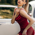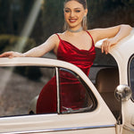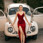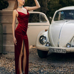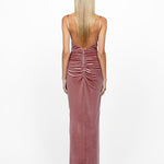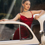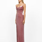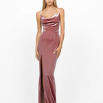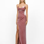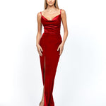 Feel sultry in the Monika. The cowl neckline drapes softly across the chest, smooth velvet fabric and front side split to accentuate your leg height. Pair with chunky gold accessories for a more glamorous look.