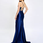 This gown is designed with a sweetheart neckline and slender straps that frame the shoulders, finished with a strappy back detail. The semi-sheer corset bodice is intricately embellished with sequins and structured with boning for definition. A draped full-length skirt falls into a fluid train, cut with a thigh-high split for added movement. Fully lined and secured with an invisible zip closure at the back.