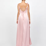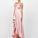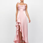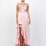 Feminine and flirty with a touch of drama, this satin hi-lo dress is all about the details. Featuring a rosette-embellished cowl neckline and twisted straps, it turns heads from every angle. The low scoop back with adjustable strappy detail adds a sultry touch, while the draped hi-lo skirt features a cut-away side split and cascading ruffle hem for show-stopping movement. Finished with an invisible zip and partial lining for a seamless fit.