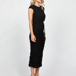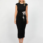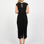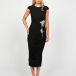 Make a stunning statement with this elegant midi dress that combines sophistication and modern flair. The covered high neckline with cap sleeves offers a refined look, while the asymmetric ruched bodice with a keyhole slit at the back adds a touch of daring allure. A striking diamante applique at the side front elevates the design with a subtle yet glamorous sparkle. The fitted midi skirt features allover ruching for a flattering, contouring fit, complemented by a back split that allows for effortless movement. Fully lined with an invisible back zip closure, this dress provides both comfort and style.