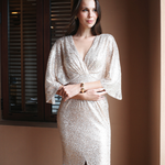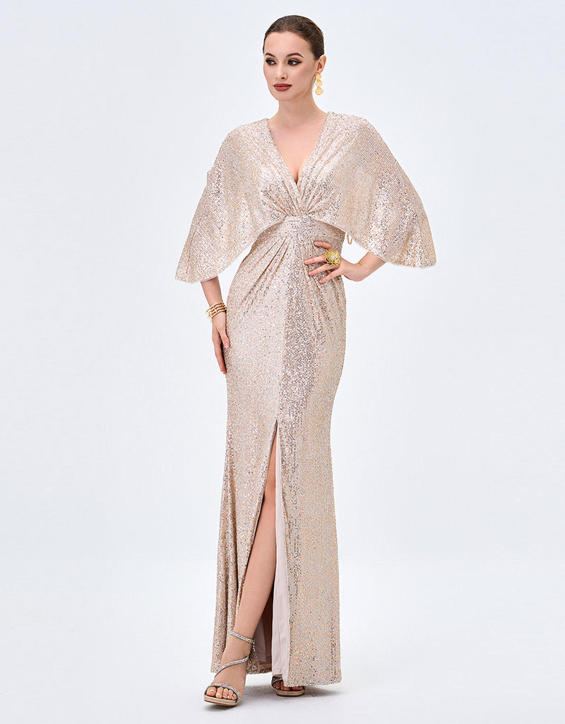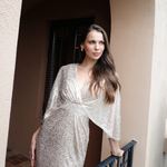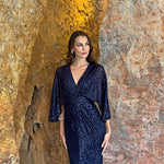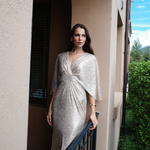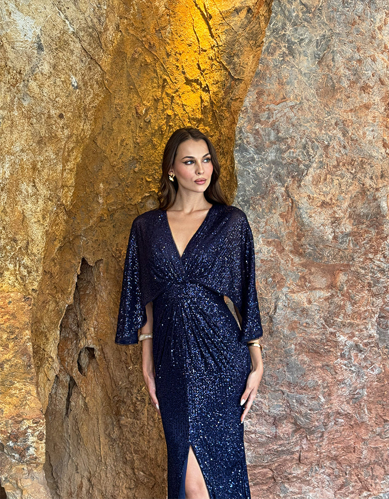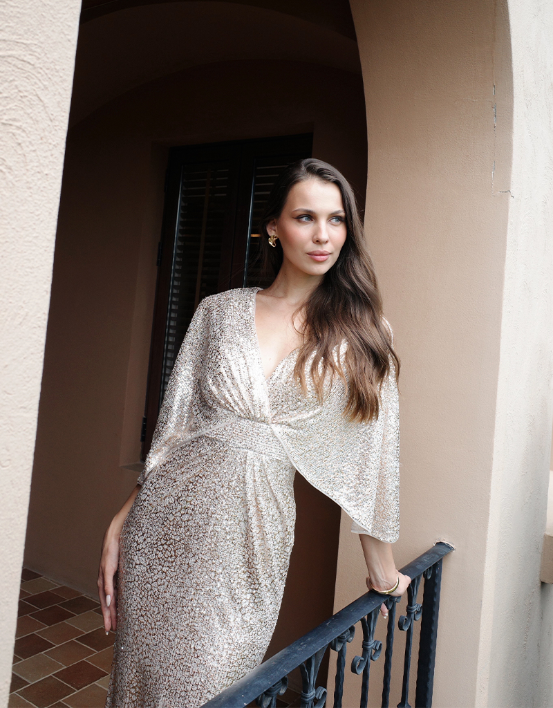 Our Cape Gown has very quickly become a fan favourite and is back again. Due to her sophisticated and polished nature, she flatters the body and will ensure you leave your mark at any event. A light batwing sleeve has been balanced beautifully with a draped waist panel and draped skirt with a slight tummy cover. Chic, yet comfortable she is a must!