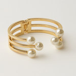 Add a touch of timeless glamour to your look with this Pearl Orbit Gold Cuff Bracelet. Featuring a structured open-cuff silhouette with polished gold-tone plating, this piece is elevated by luminous faux-pearl accents arranged in a modern, sculptural formation. Chic, elegant and effortless — perfect for evening styling or adding sophistication to your everyday fit.